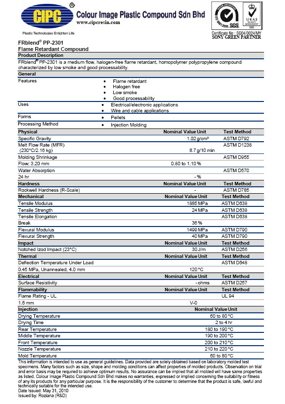 *The mold shrinkage values herein are soley based on our own laboratory testing specimens. Users are strongly advised to conduct their own test as molding conditions, mold design, thickness all play a part in determining the part shrinkage. |